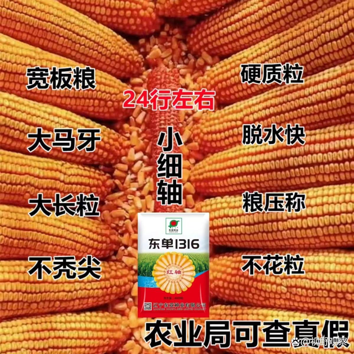 加工特性:马齿型籽粒赋予东单 1316 良好的脱粒性,收获时,脱粒轻松高效,出籽率超 80%,减少了收获损耗。商品粮外观金黄均匀,颗粒饱满,在市场上极具竞争力,凭借出色卖相,获得 5% - 8% 的市场溢价空间。农户们不仅能收获高产玉米,还能因优质品质卖上好价钱,实现增产又增收,东单 1316 成为连接农业生产与市场的优质纽带 。